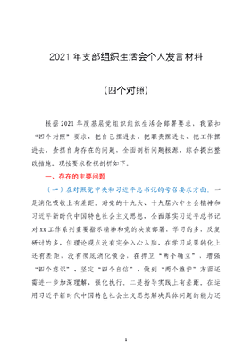 2021年支部组织生活会个人发言材料(四个对照).doc