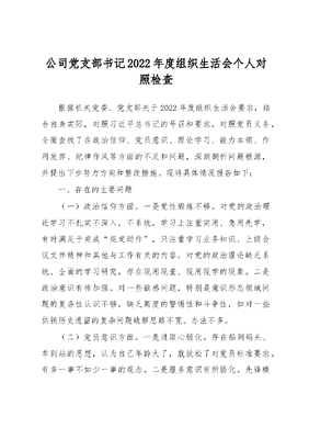 公司党支部书记2022年度组织生活会个人对照检查.docx