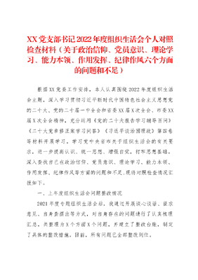 XX党支部书记2022年度组织生活会个人对照检查材料(关于政治信仰、党员意识、理论学习、能力本领、作用发挥、纪律作风六个方面的问题和不足).docx