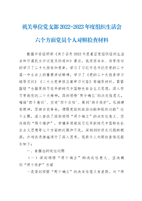 机关单位党支部2022-2023年度组织生活会六个方面党员个人对照检查材料.docx