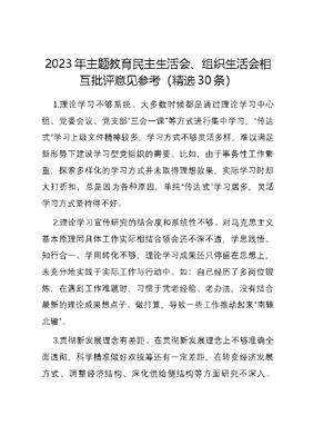 2023年主题教育民主生活会、组织生活会相互批评意见参考(精选30条).docx