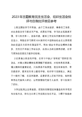 2023年主题教育民主生活会、组织生活会批评与自我批评意见参考.docx