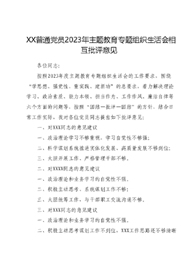 XX普通党员主题教育专题组织生活会相互批评意见.docx