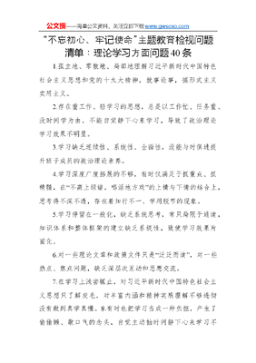 (40条)“不忘初心、牢记使命”主题教育检视问题清单:理论学习方面问题.docx
