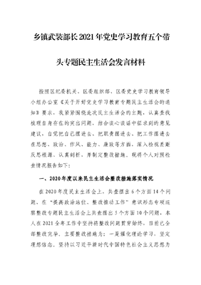 乡镇武装部长2021年党史学习教育五个带头专题民主生活会发言材料.docx