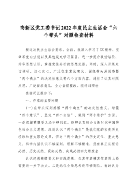 高新区党工委书记2022年度民主生活会“六个带头”对照检查材料.docx
