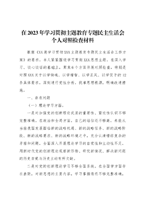 在2023年学习贯彻主题教育专题民主生活会个人对照检查材料.docx
