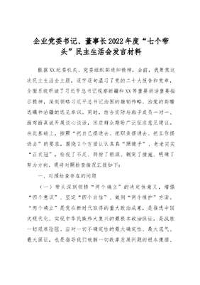 企业党委书记、董事长2022年度“七个带头”民主生活会发言材料.docx