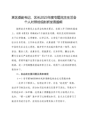 某区委副书记、区长2023年度专题民主生活会个人对照检视剖析发言提纲(新六个对照方面).docx