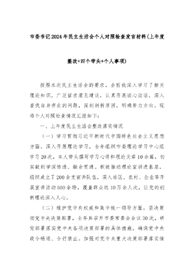 市委书记2024年民主生活会个人对照检查发言材料(上年度整改+四个带头+个人事项).docx