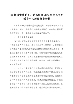 XX集团党委委员、副总经理2022年度民主生活会个人对照检查材料.docx