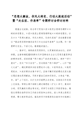 “思想大解放、作风大转变、行动大提速活动”暨“走在前、作表率”专题研讨会研讨材料.docx