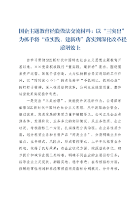国企主题教育经验做法交流材料:以“三突出”为抓手 将“重实践、建新功”落实到深化改革提质增效上.docx