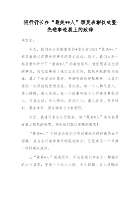 银行行长在“最美xx人”颁奖表彰仪式暨先进事迹展上的致辞.docx