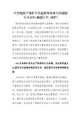 局党组关于煤矿安全监察体制建立的经验交流材料(集团公司-煤矿).docx