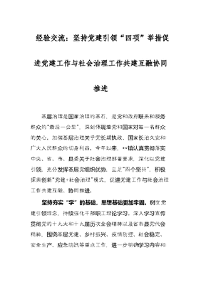 经验交流:坚持党建引领“四项”举措促进党建工作与社会治理工作共建互融协同推进.docx