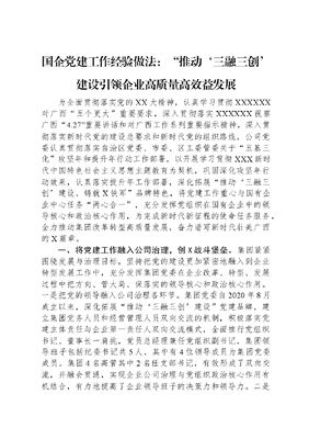国企党建工作经验做法:“推动‘三融三创’建设+引领企业高质量高效益发展.docx