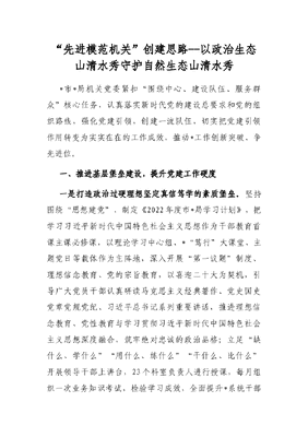 “先进模范机关”创建思路--以政治生态山清水秀 守护自然生态山清水秀.docx