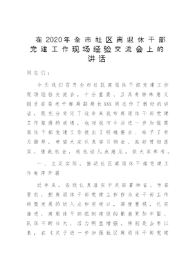 在2020年全市社区离退休干部党建工作现场经验交流会上的讲话.doc