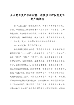 企业复工复产经验材料:狠抓项目扩投资 复工复产稳经济.docx