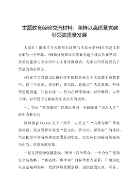 主题教育经验交流材料:坚持以高质量党建引领高质量发展.docx
