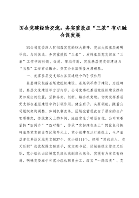 国企党建经验交流:务实重效抓“三基”有机融合促发展.docx