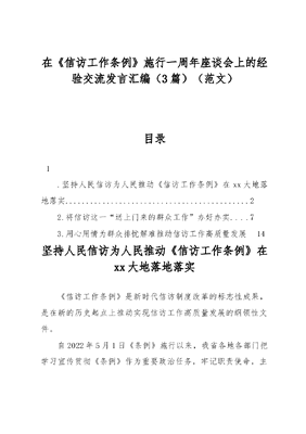 (3篇)在《信访工作条例》施行一周年座谈会上的经验交流发言汇编(范文).docx