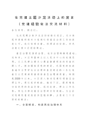 在党建主题沙龙活动上的发言(党建经验做法交流材料).doc