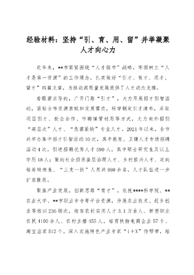 经验材料:坚持“引、育、用、留”并举凝聚人才向心力.docx