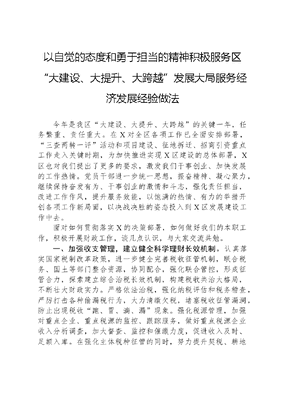 以自觉的态度和勇于担当的精神积极服务区“大建设、大提升、大跨越”发展大局服务经济发展经验做法.docx