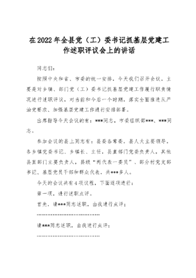 在2022年全县党(工)委书记抓基层党建工作述职评议会上的讲话.docx