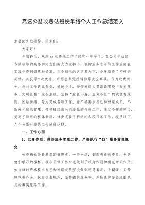 高速公路收费站班长年终个人工作总结范文述职报告.docx