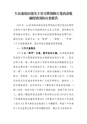 X区委组织部关于学习贯彻执行党内法规制度情况的自查报告.docx