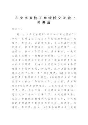 在全市政协工作经验交流会上的讲话.doc