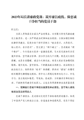 2023年局长讲廉政党课:筑牢廉洁底线,做忠诚干净担当的党员干部.docx