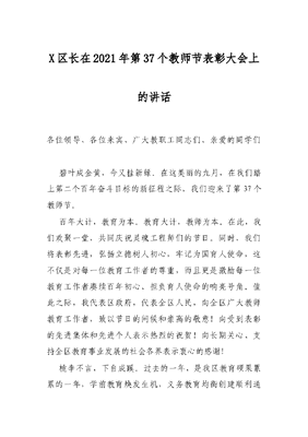X区长在2021年第37个教师节表彰大会上的讲话.docx