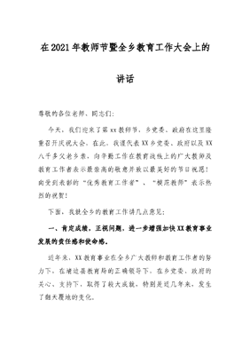 在2021年教师节暨全乡教育工作大会上的讲话.docx