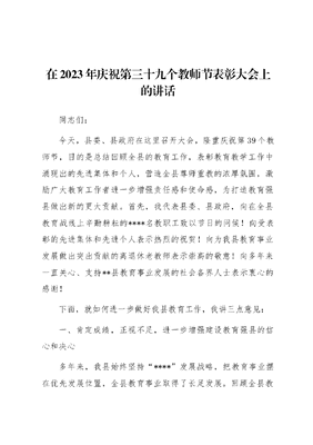 在2023年庆祝第三十九个教师节表彰大会上的讲话.docx