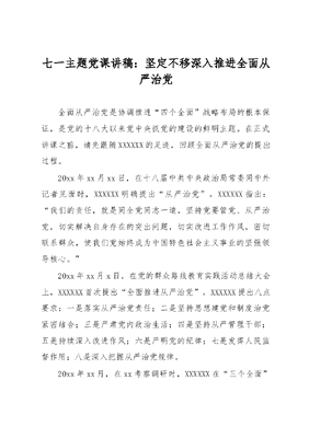七一主题党课讲稿:坚定不移深入推进全面从严治党.docx