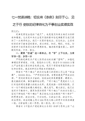 七一党课讲稿:切实将《条例》刻印于心、见之于行使铁的纪律转化为干事创业实绩实效.docx