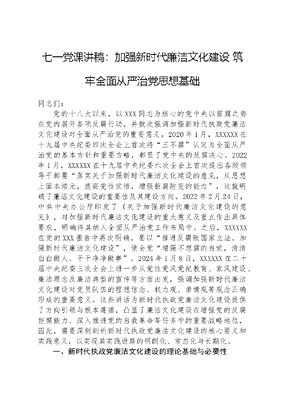 七一党课讲稿:加强新时代廉洁文化建设+筑牢全面从严治党思想基础.docx