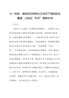 七一党课:使铁的纪律转化为党员干部的自觉遵循,让铁纪“长牙”警钟长鸣.docx