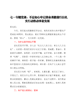 七一专题党课:不忘初心 牢记使命 勇毅前行 以扎实行动推动事业发展.docx