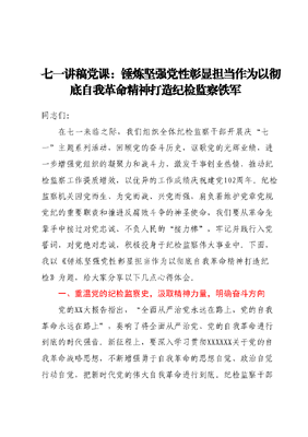 七一讲稿党课:锤炼坚强党性彰显担当作为以彻底自我革命精神打造纪检监察铁军.docx