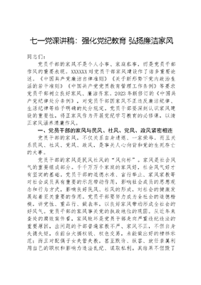 七一党课讲稿:强化纪律教育+弘扬廉洁家风.docx