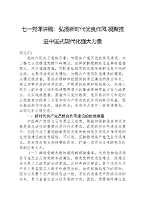 七一党课讲稿:弘扬新时代优良作风+凝聚推进中国式现代化强大力量.docx