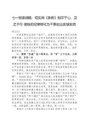 七一党课讲稿:切实将《条例》刻印于心、见之于行 使铁的纪律转化为干事创业实绩实效.docx