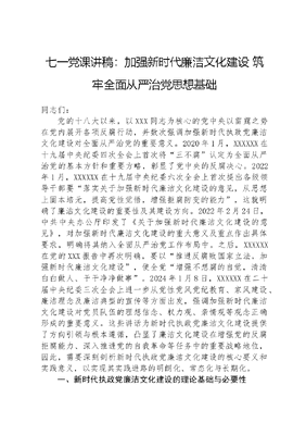 七一党课讲稿:加强新时代廉洁文化建设 筑牢全面从严治党思想基础.docx