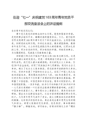 在迎“七一”庆祝建党103周年青年党员干部交流座谈会上的讲话提纲.docx