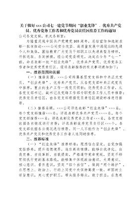 关于做好xxx公司七一建党节期间“创业先锋”、优秀共产党员、优秀党务工作者和优秀党员责任区推荐工作的通知.docx